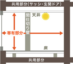 専有部分のみリフォームができます。専有部分とは玄関の内側からサッシの内側までの居住部分のことで、コンクリートの壁・床・天井・柱の内側で、床下や天井裏、間仕切り壁は専有部分になります。